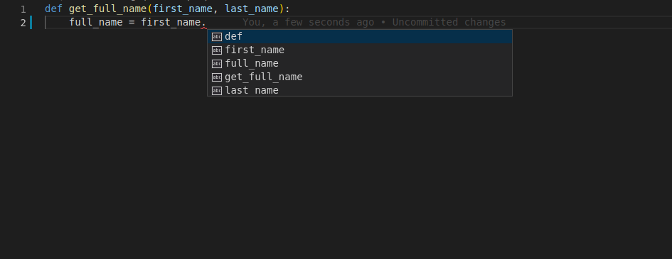 Você digita o primeiro parâmetro da função, first_name, depois um ponto (.) e, em seguida, pressiona Ctrl + Space para acionar a conclusão.