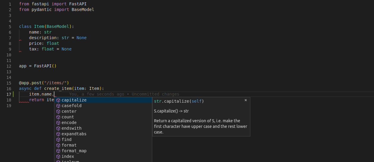 No seu editor de texto, dentro da função você receberá dicas de tipos e completação em todo lugar (isso não aconteceria se você recebesse um dict em vez de um modelo Pydantic):